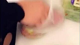 huge boobs babe oils body masturbates kitchen with big dildos