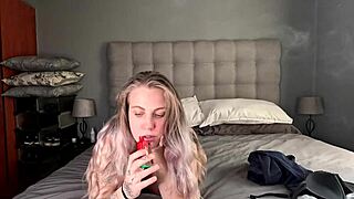 kinky blonde stuffs stockings into her pussy while masturbating