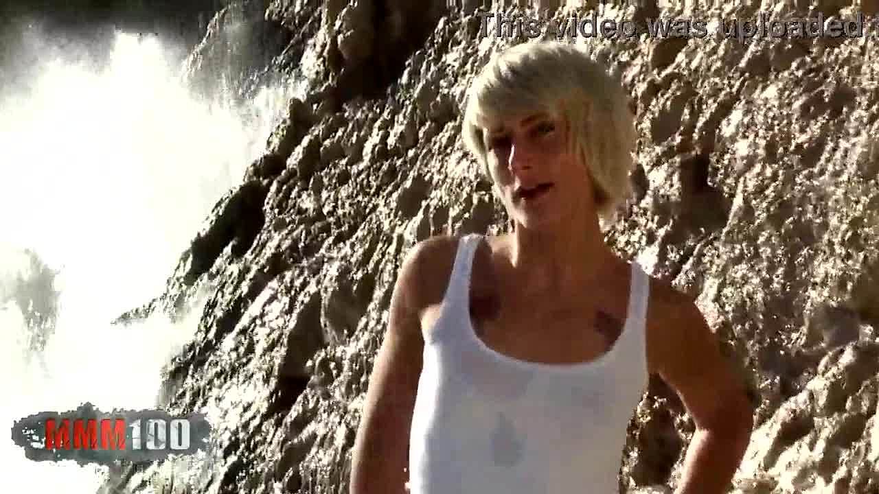 Flashing striptease teen 18+ blonde in bikini by the beach in public