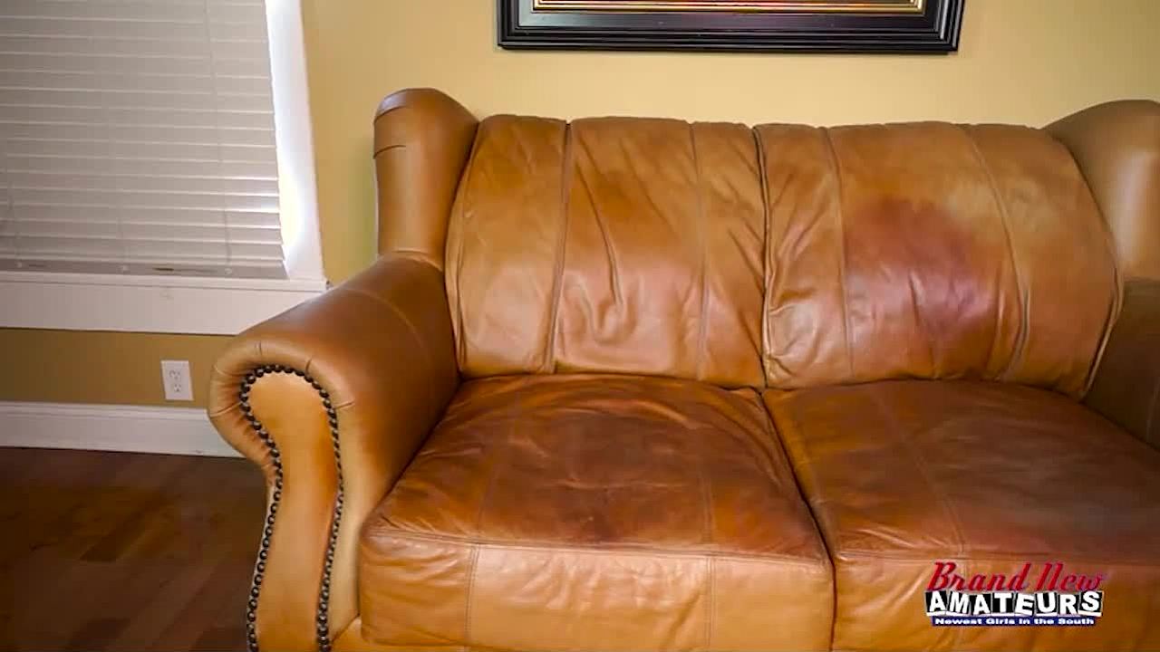 My hot stepsister masturbates in the living room. I help her, and she sucks my dick and swallows my cum.
