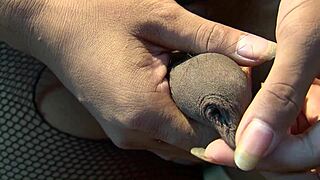 close-up shemale self-sucks cock while fingering ass